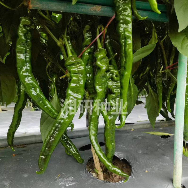 中早熟、軟皮、高品質(zhì)、皺皮椒品種。植株生長勢較強,株高60cm,葉色深綠;果實長牛角形,果長約28cm,果寬約2.8cm;青熟果翠綠色,紅熟果紅色,單果重40g左右,果表稍皺,皮薄,肉質(zhì)脆嫩,品質(zhì)好,前后期果實一致性好,耐低溫寡日照能力強,連續(xù)掛果能力強,綜合抗性好,適宜早春大棚、秋延后大棚栽培或露地豐產(chǎn)栽培。適應(yīng)性與栽培措施: