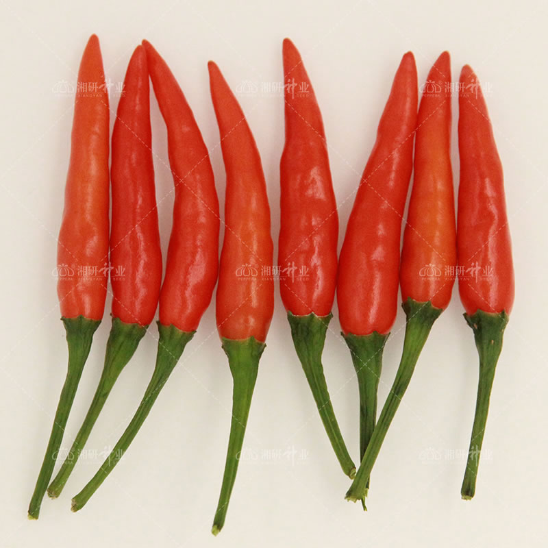 中熟單生小果朝天椒品種,植株生長勢較強(qiáng),株高90cm左右,株幅86x86cm,首節(jié)位12-15節(jié);果實(shí)單生,朝天,果實(shí)小羊角形,果長5.5cm左右,果寬0.8-1.0cm,果肉厚0.1cm,2個(gè)心室為主,果頂尖;單果重3.7g左右,表面光亮,青熟果綠色,紅熟果紅色,果頂尖,果皮薄,辣香味濃郁,干后亮度好,豐產(chǎn)潛力大,耐濕熱,抗疫病及炭疽病能力強(qiáng),易栽培。適合紅椒鮮食上市或干制加工。
