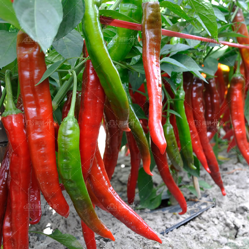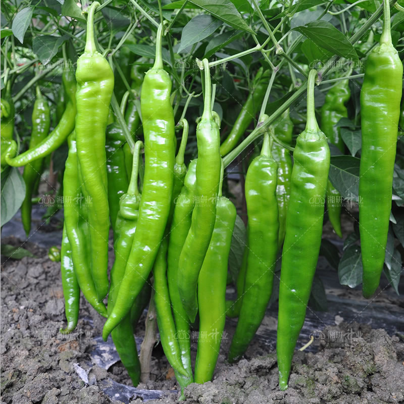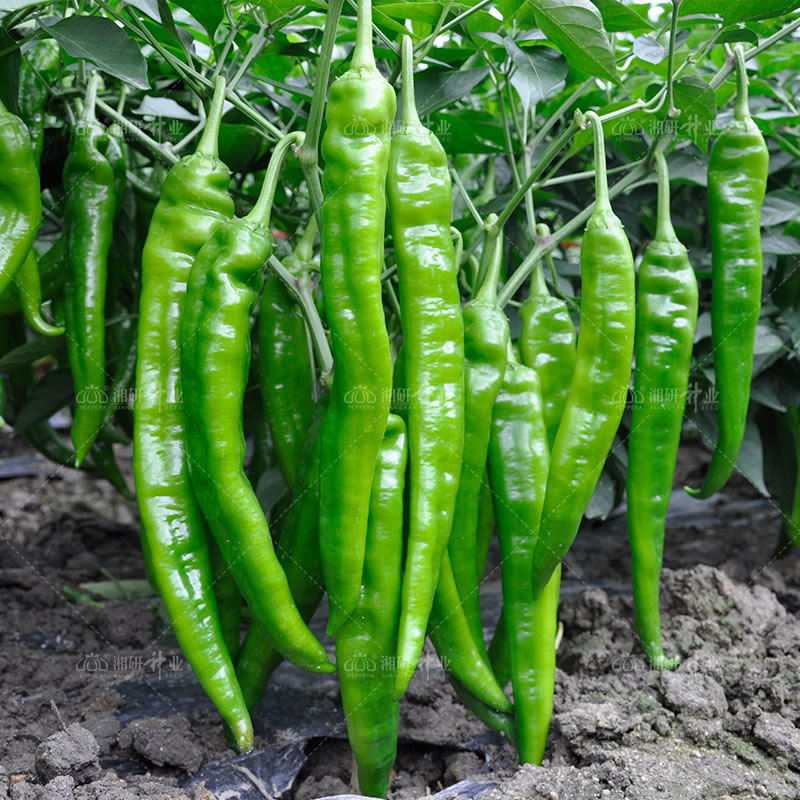 中熟、淺綠色、長(zhǎng)牛角椒品種。植株生長(zhǎng)勢(shì)強(qiáng),樹(shù)型高大,直立性較好,節(jié)間短,葉色濃綠;果實(shí)長(zhǎng)牛角形,淺綠色,結(jié)果能力強(qiáng),坐果集中,連續(xù)結(jié)果性好;味微辣,皮薄,肉質(zhì)脆嫩,果形整齊一致,商品性好,耐貯運(yùn),后期抗性和商品性好。